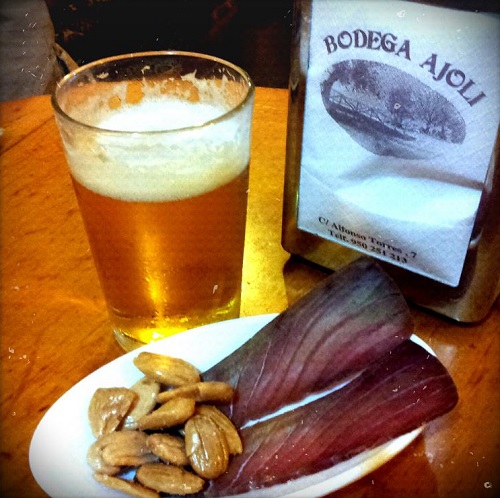 Un extra ball colofón de la jornada. Entre el Felipe y la Bien Pagá había habido bastante guerra y alguna caña que otra, pero siempre hay una última tentación en la que caer. Alimentar el momento coche escoba. Caña y mojama con almendras recién fritas. En la calle Alfonso Torres nº7. Centro de la ciudad. Bodega Ajolí. Fin de la jornada, que no es tontería.